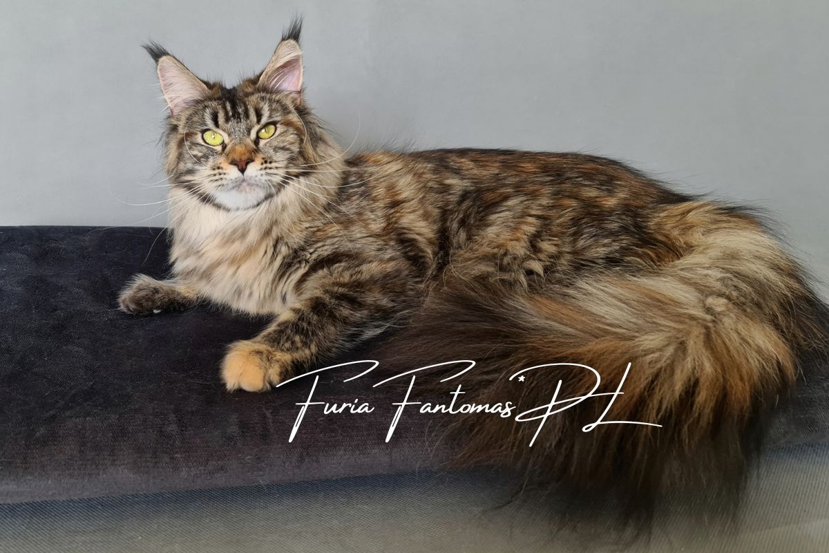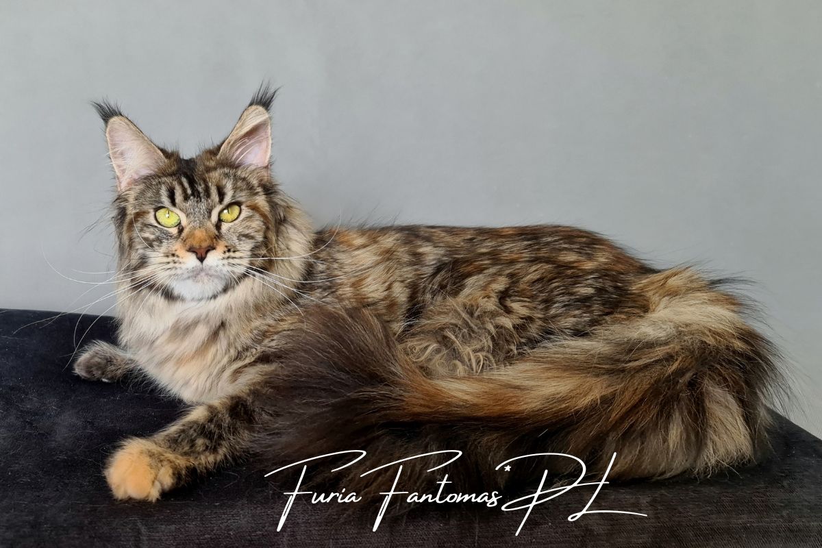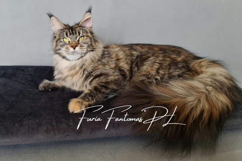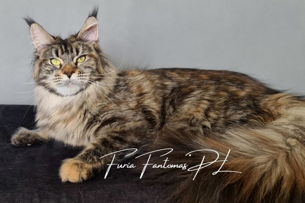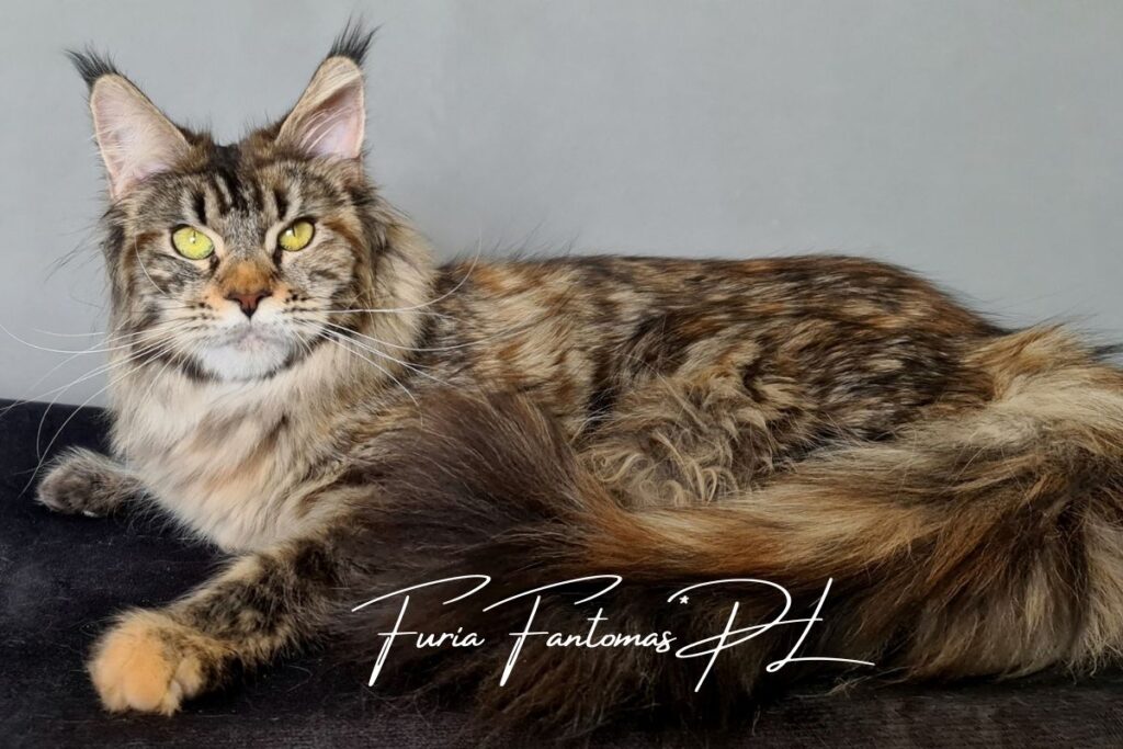 Furia jest kotką urodzoną w naszej hodowli. Od małego wyróżniała się wyjątkową urodą i… gadatliwością 😉 Jest cudowną, słodką gadułą, która uwielbia spędzać czas z naszymi dziećmi. Furia jest troskliwą mamą i mimo dorosłego wielu, nadal bardzo chętnie szaleje za wędką z piórkami czy piłeczkami z dzwoneczkiem. Zakochani jednak jesteśmy nie tylko w jej charakterze ale również w wyglądzie. To kotka o mocnych rysach, gęstym, pięknie wybarwionym futrze i imponującym ogonie. Mamy nadzieję, że będzie przekazywać te cechy swoim dzieciom ❤