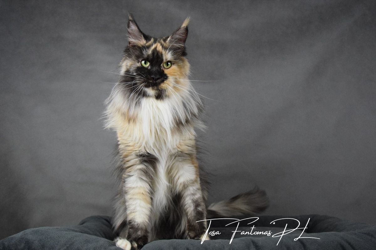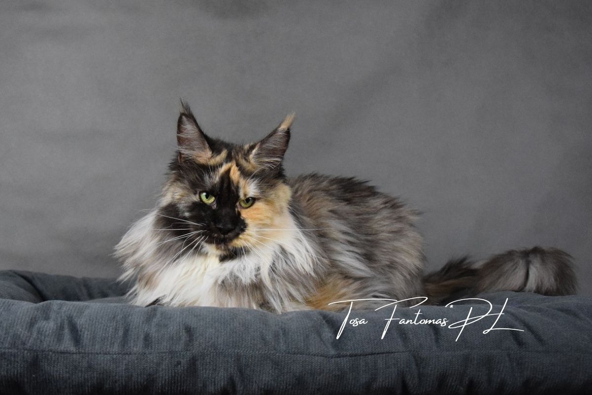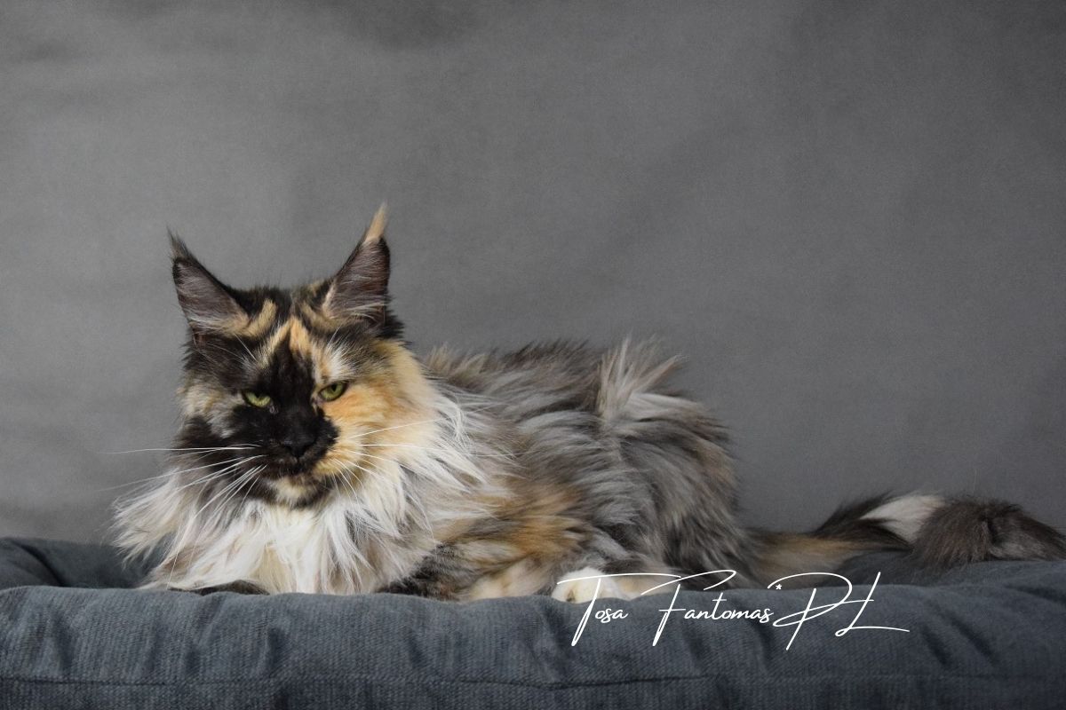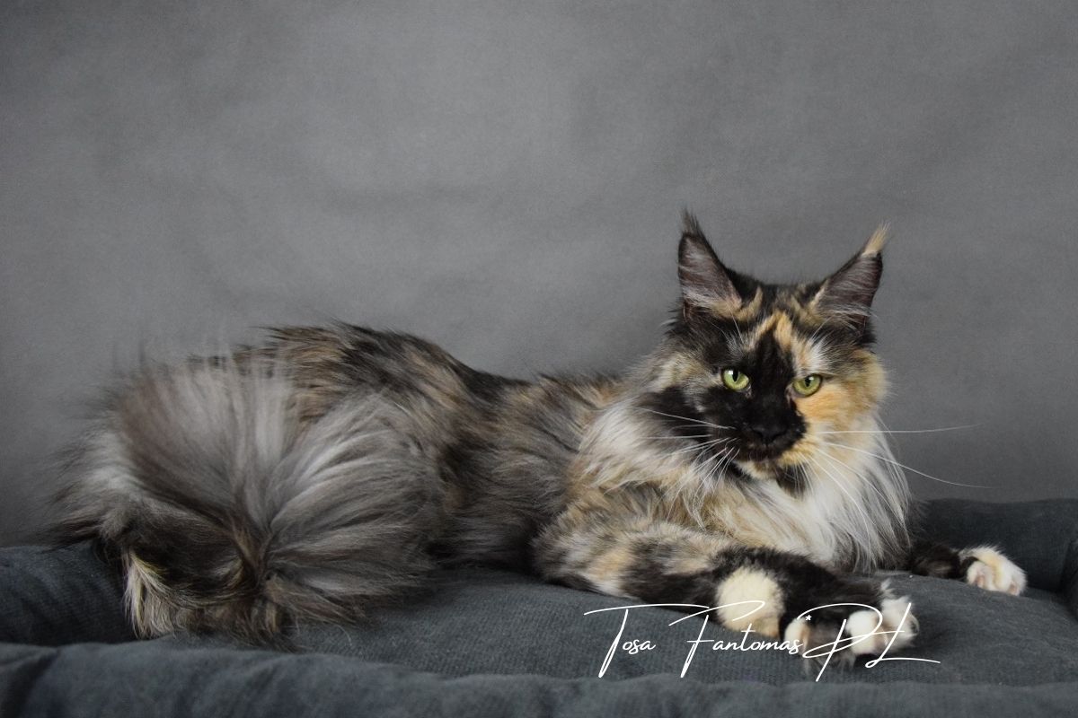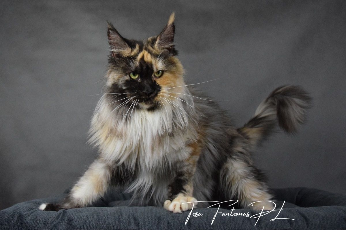 Furia jest kotką urodzoną w naszej hodowli. Od małego wyróżniała się wyjątkową urodą i… gadatliwością 😉 Jest cudowną, słodką gadułą, która uwielbia spędzać czas z naszymi dziećmi. Furia jest troskliwą mamą i mimo dorosłego wielu, nadal bardzo chętnie szaleje za wędką z piórkami czy piłeczkami z dzwoneczkiem. Zakochani jednak jesteśmy nie tylko w jej charakterze ale również w wyglądzie. To kotka o mocnych rysach, gęstym, pięknie wybarwionym futrze i imponującym ogonie. Mamy nadzieję, że będzie przekazywać te cechy swoim dzieciom ❤