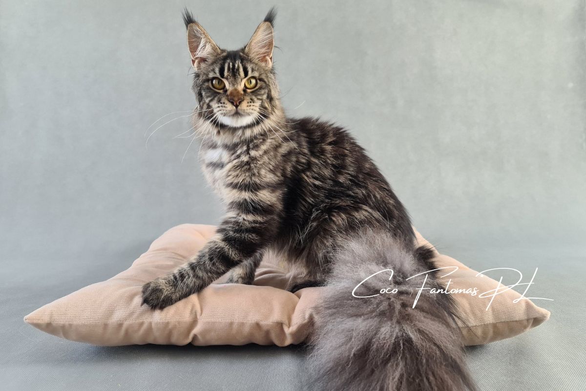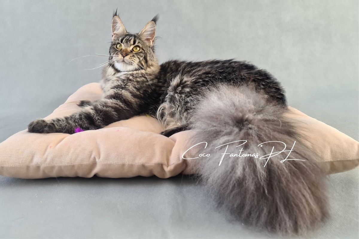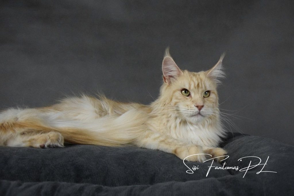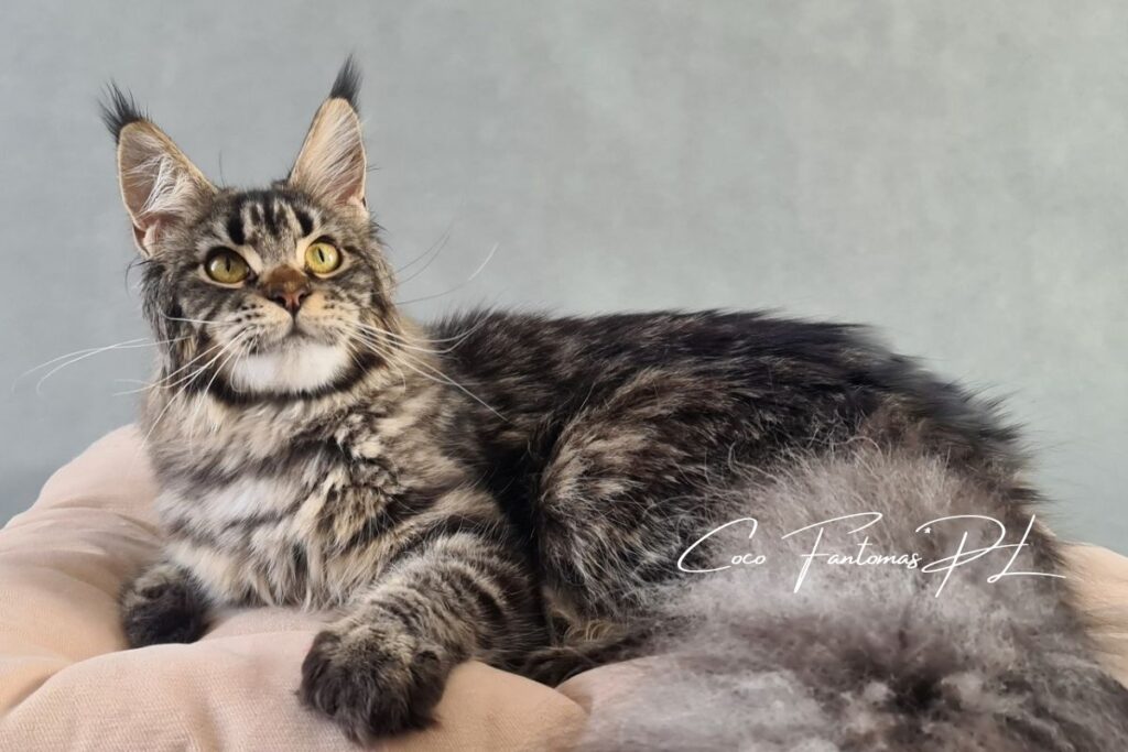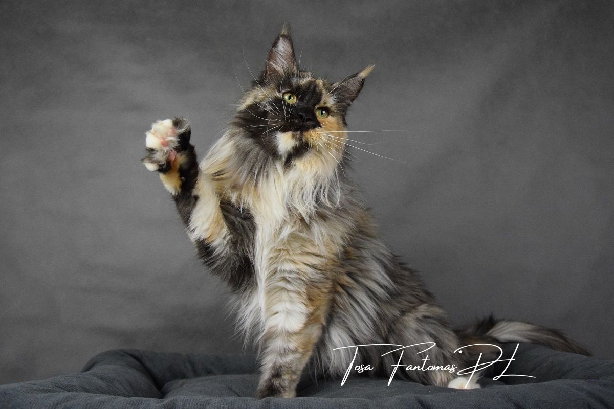Furia jest kotką urodzoną w naszej hodowli. Od małego wyróżniała się wyjątkową urodą i… gadatliwością 😉 Jest cudowną, słodką gadułą, która uwielbia spędzać czas z naszymi dziećmi. Furia jest troskliwą mamą i mimo dorosłego wielu, nadal bardzo chętnie szaleje za wędką z piórkami czy piłeczkami z dzwoneczkiem. Zakochani jednak jesteśmy nie tylko w jej charakterze ale również w wyglądzie. To kotka o mocnych rysach, gęstym, pięknie wybarwionym futrze i imponującym ogonie. Mamy nadzieję, że będzie przekazywać te cechy swoim dzieciom ❤