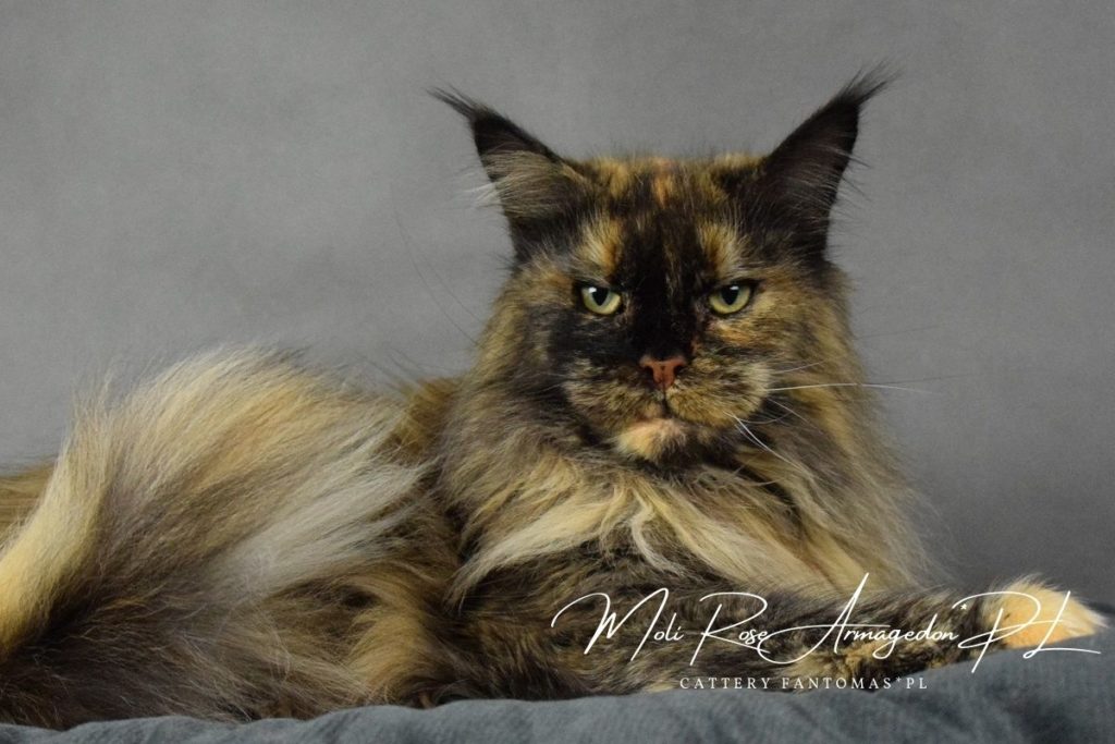 Moli jest dużą i masywną kotką o ciekawym fenotypie. Mimo dużej konkurencji wystawowej wśród kotek szylkretowych szybko zdobyła tytuł International Champion. To kot o idealnym charakterze, zawsze wzorowo odchowuje swoje kocięta i chętnie matkuje innym kociakom. Jest czuła i delikatna w stosunku do naszych dzieci jak i do nas. Z charakteru przypomina bardziej psa niż kota, nigdy nie chadza własnymi ścieżkami, woli nasze 😉