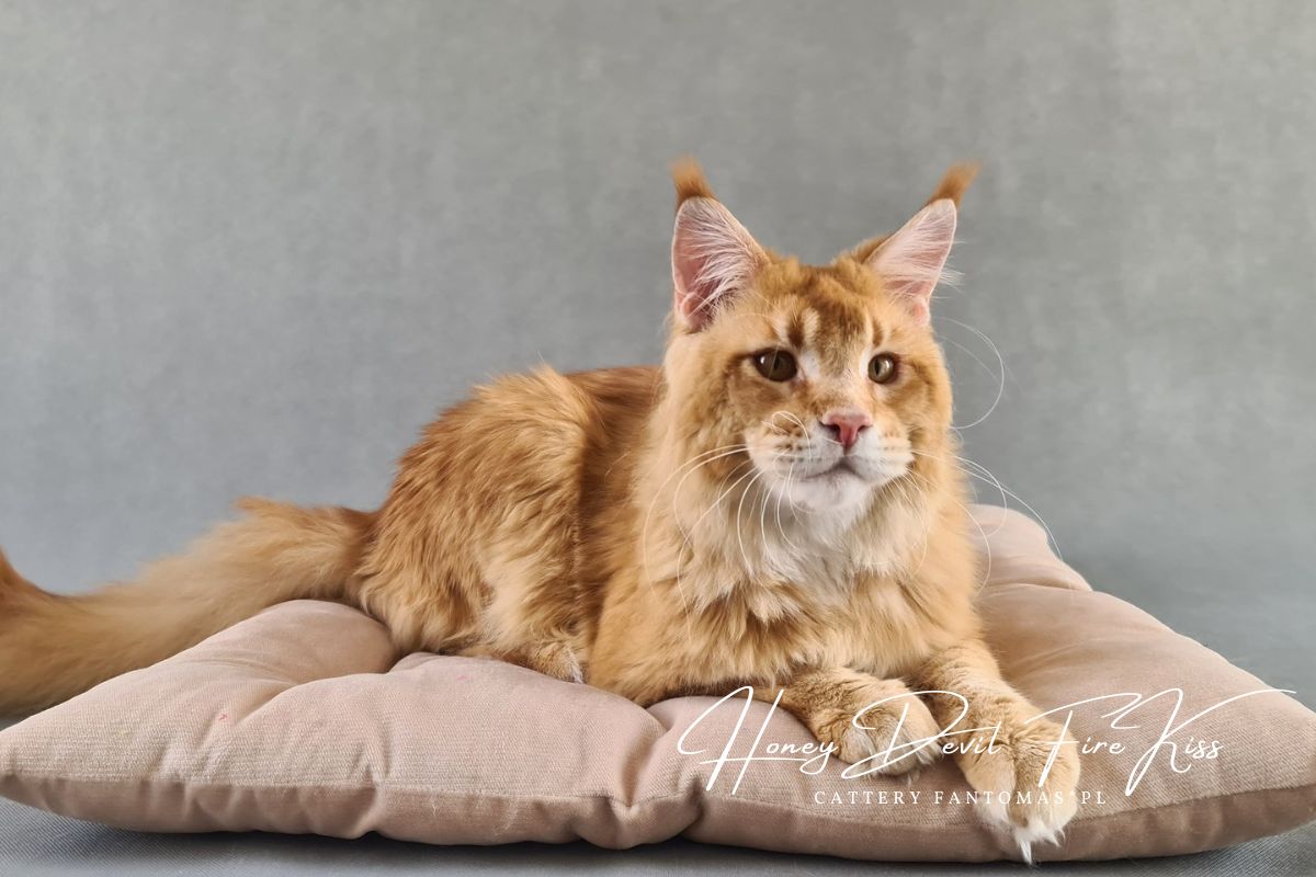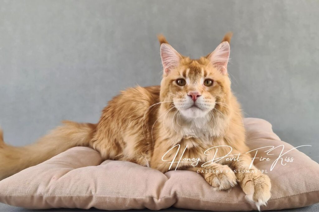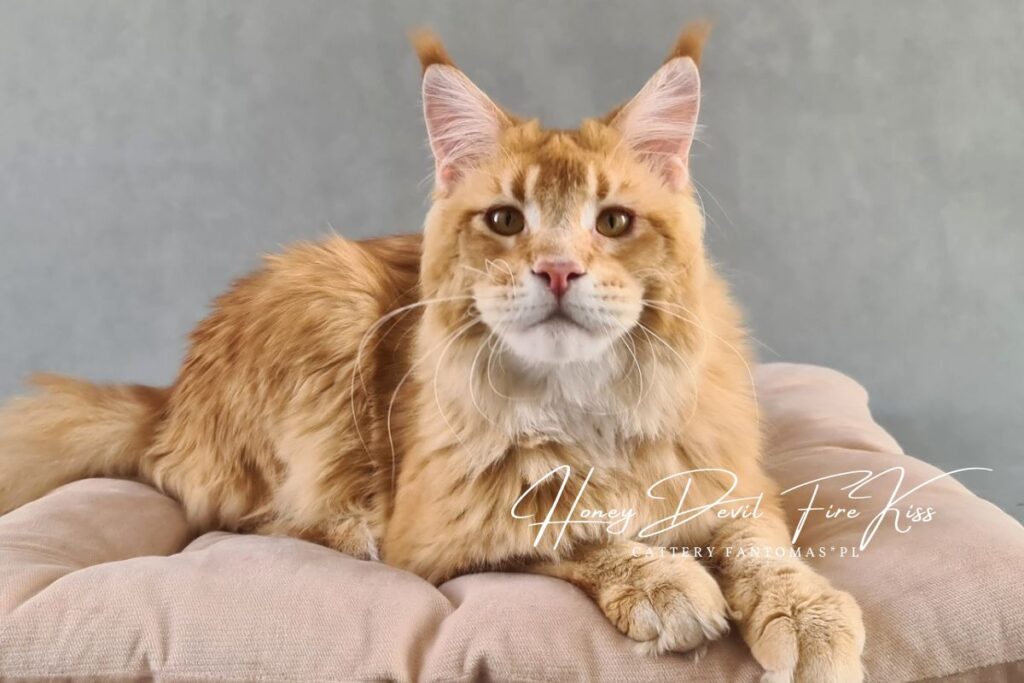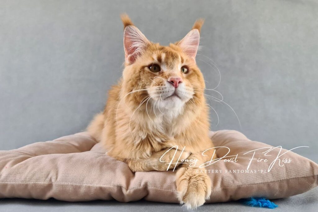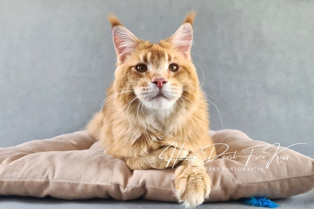 Po czarnym kocurze, zapragnęliśmy mieć również rudego. Musiał to być jednak wyjątkowy kot i to tak rudy, że bardziej się nie da 😉 Gdy zobaczyliśmy FireKissa po raz pierwszy, wiedzieliśmy, że to ON! W domu nazywamy go Benjim. Jest jak dziecko w kociej skórze, które domaga się uwagi głośnymi pomrukami i miauknięciami. Benji jest straszną gadułą, co bardzo w nim kochamy. Ten kocur uwielbia kontakt z kociętami (w końcu sam jest jeszcze jak na swój wiek kociakiem). Nadal jest na etapie dojrzewania i stawania się mężnym kocurem. Już nie możemy się doczekać, jak będzie wyglądał w wieku 3-4 lat…